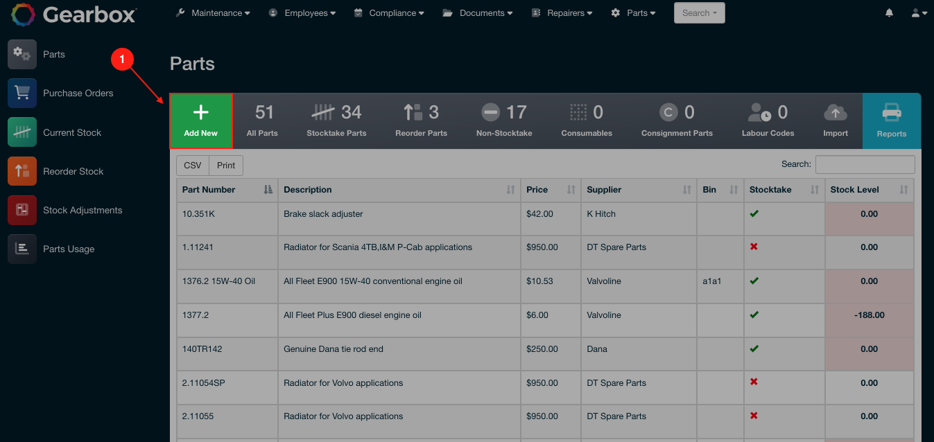1. Parts lists/catalogues can be imported in bulk using the Gearbox import tool. Click on Import (1)