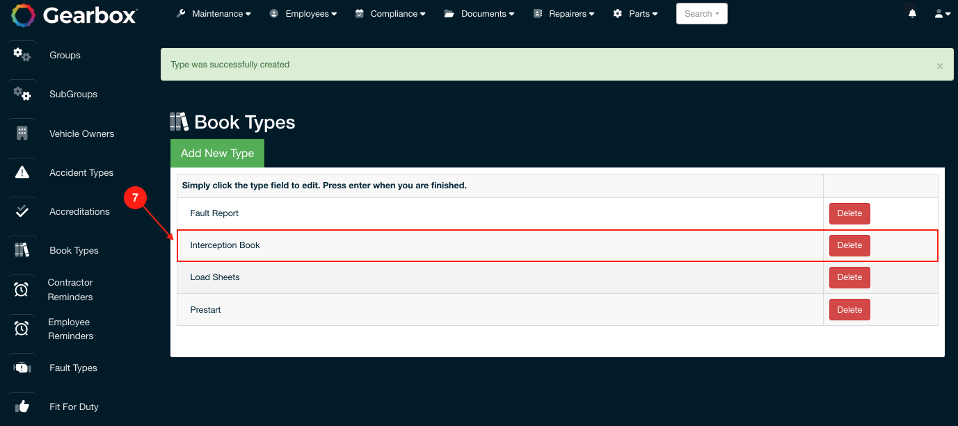 5. Once you have saved the new Book Type it will now appear in your Book Types list (7)